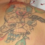 As fotos 3 4 e 5 mostram claramente a marca registrada do “matador de policia”. Todos eles tem tatuagens de palhaços pelo corpo que geralmente são desenhados com cara de mal, com cara de monstro ou até mesmo com alguma arma em punho!